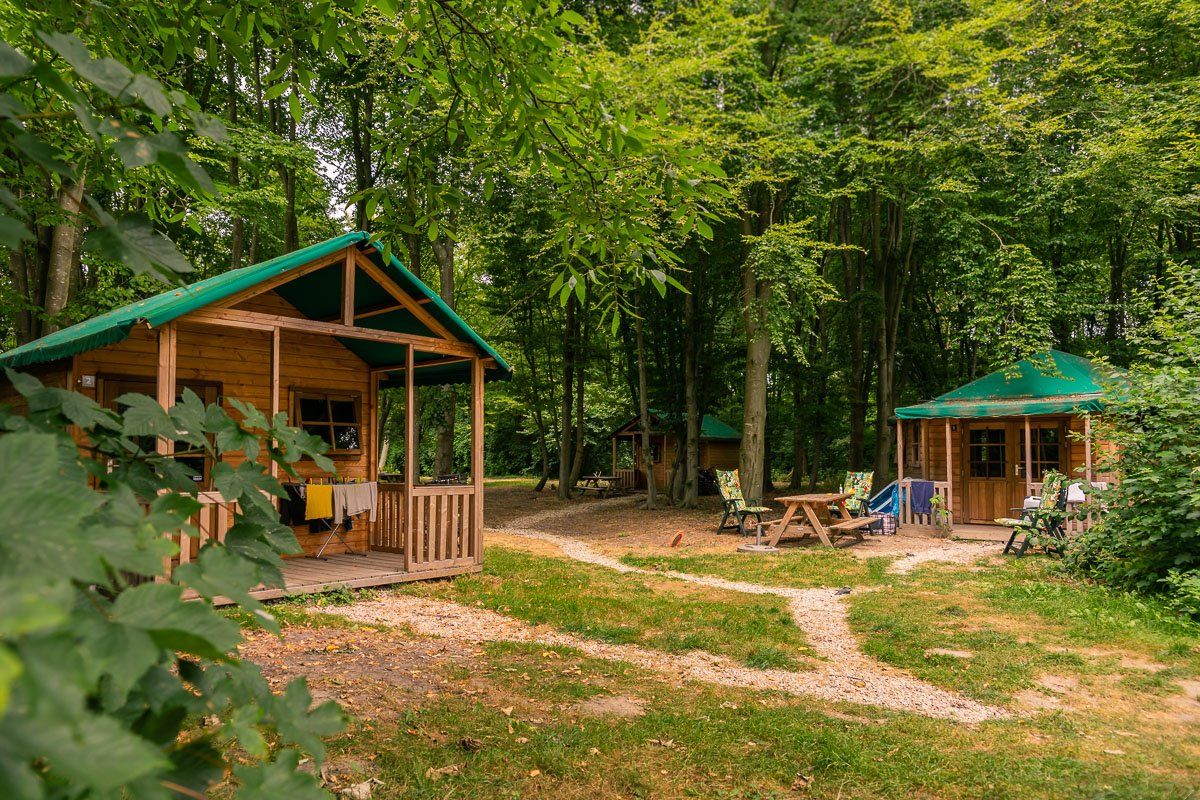 - 2 trekkershutten van ca. 11m2 op een rustig gelegen plaats in de bosrand aan de rand van het kampeerterrein, ingericht voor 4 personen: twee stapelbedden.